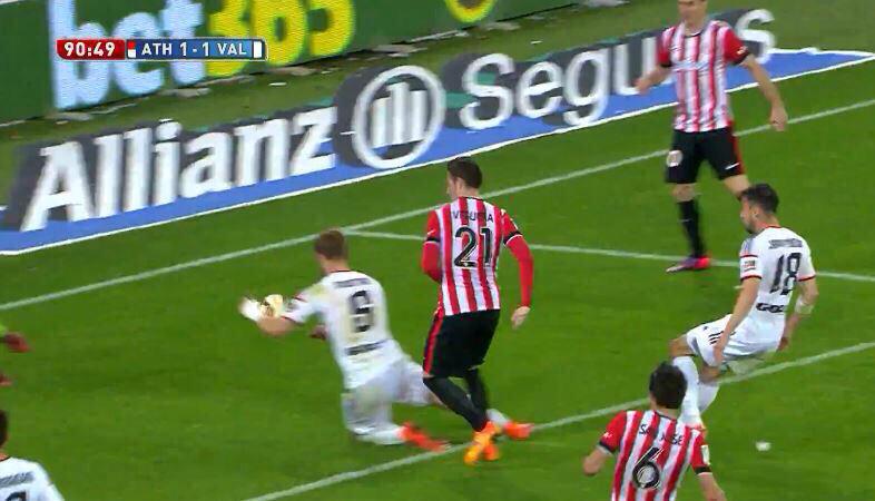 El Valencia, aún así, dispuso de dos oportunidades más de Rodrigo, que solventó Iraizoz, y en uno de los contragolpes, le tocó al Athletic, jugada por banda, tocando, que llega a Aduriz, se zafa de su defensor y pone un pase de la muerte a Viguera, que dispara, dándole al palo y dejando al placer de Aduriz el gol, en posición clara de fuera de juego. Hasta ahí bien, el árbitro vuelve a fallar en esta decisión, apenas 10 minutos después de la expulsión, pero fijándonos en las imágenes, vemos como Mustafi, en el tiro de Viguera, desvía el balón con la mano, cambiando la dirección de la pelota, hacia donde se había tirado Diego Alves. Esta mano tampoco la vio, por lo cual, doble fallo del colegiado.